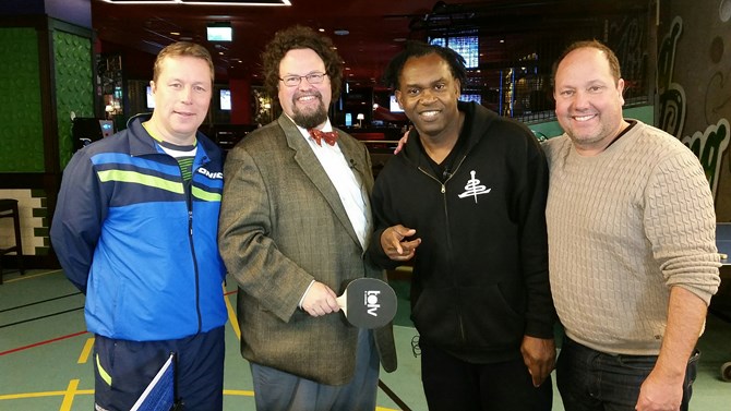 在这里,我和高尔夫球巨星伊恩•保尔特还有詹森•杜夫纳(左起第2、3个)一起向前乒乓球世界冠军约尔根•佩尔森还有江嘉良发起了挑战。